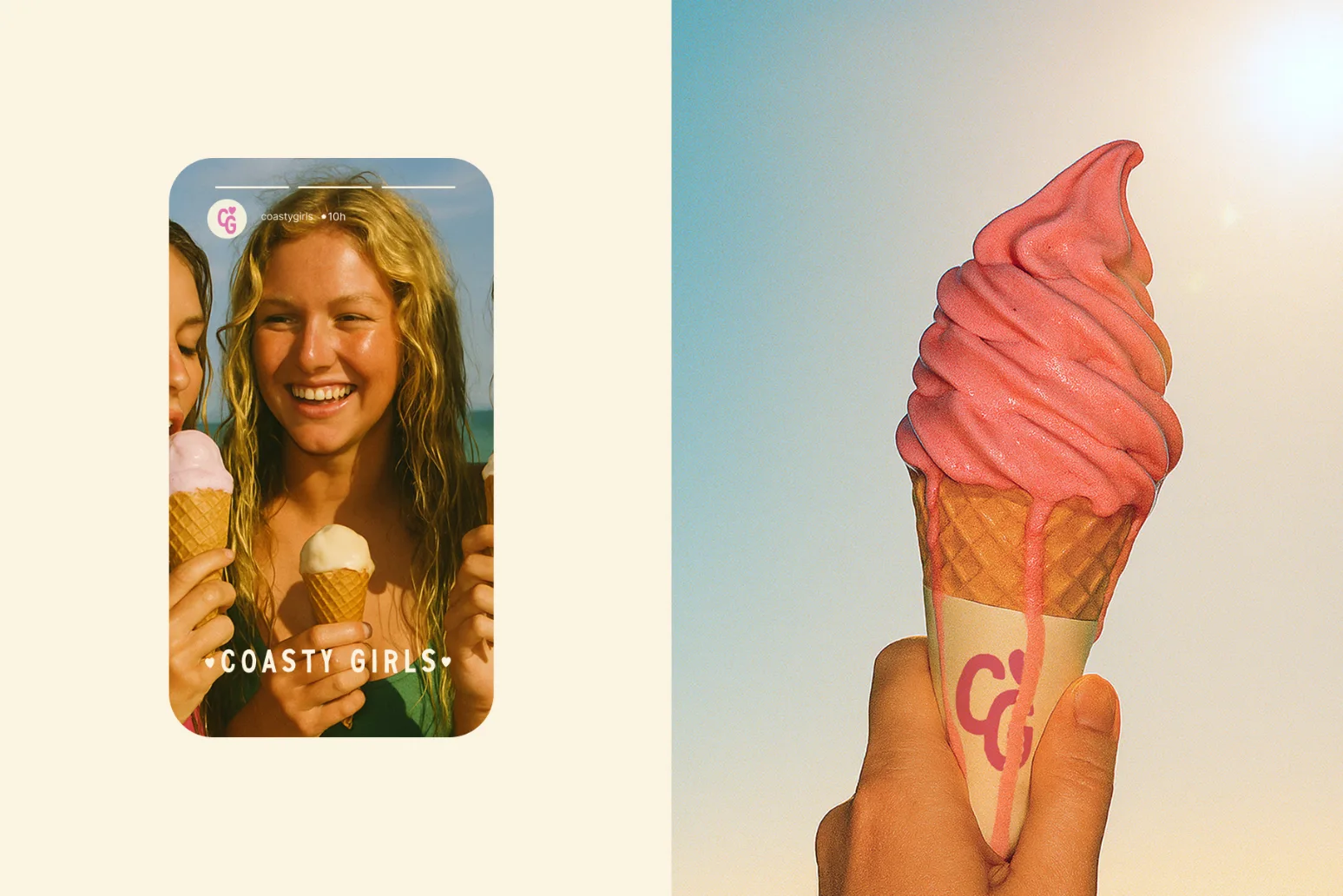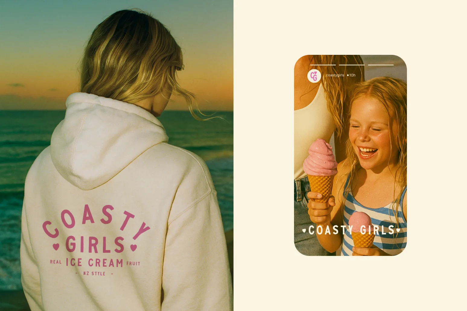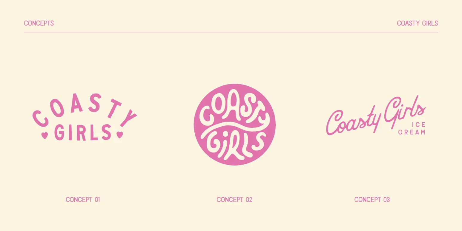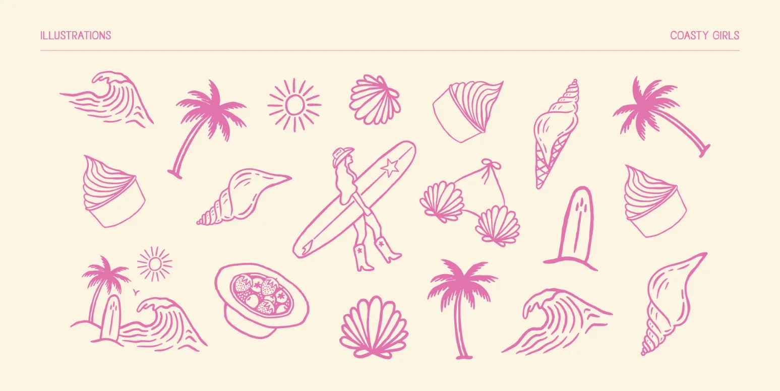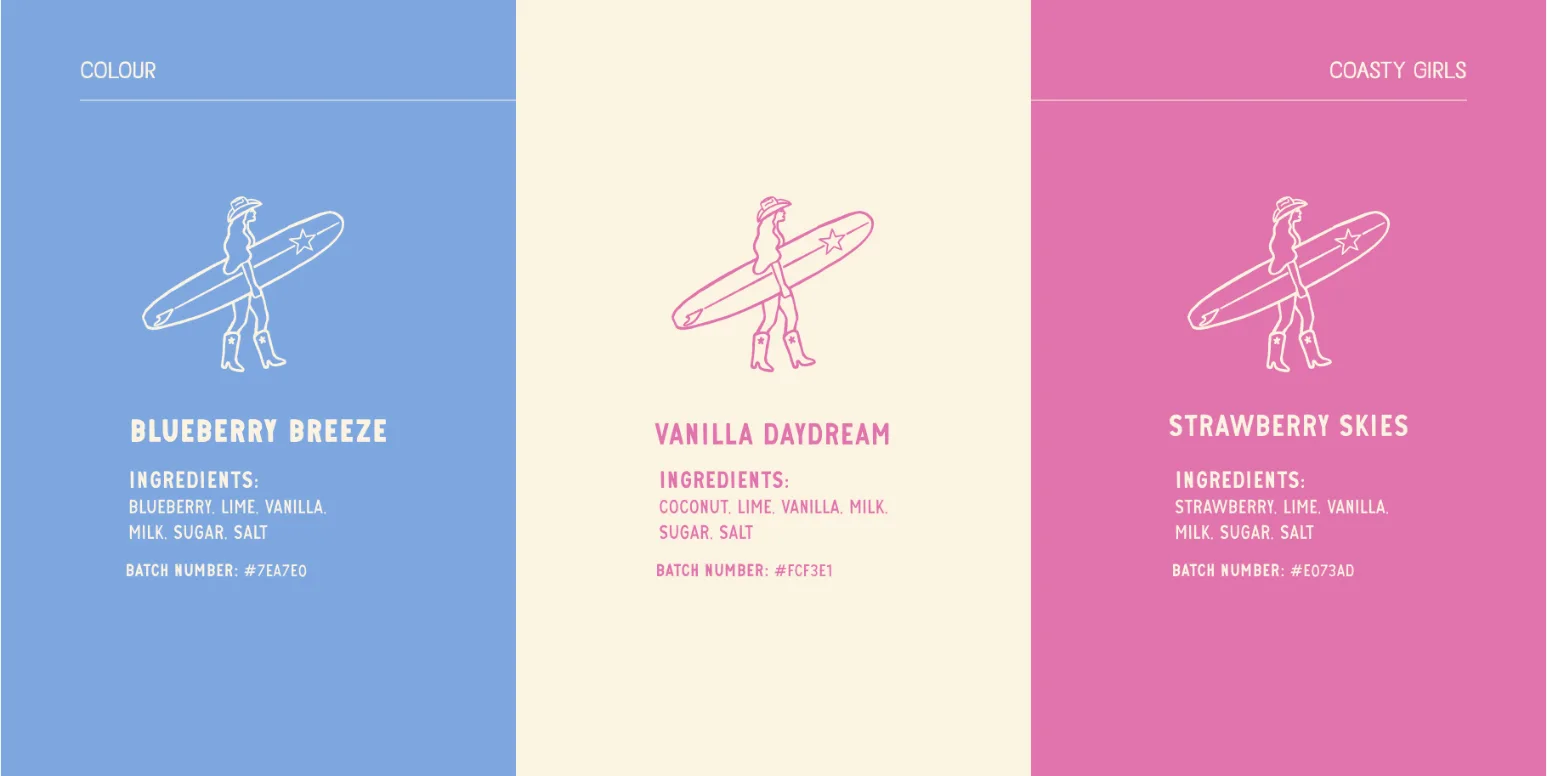 The final identity presents Coasty Girls as a confident, community-led brand ready to stand out on shelves and at the beach alike. The system translates seamlessly across packaging, merchandise, and guidelines, ensuring brand recognition while leaving space for playful expressions that reflect the brand’s personality.