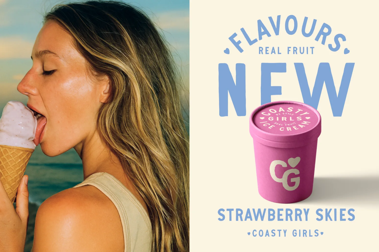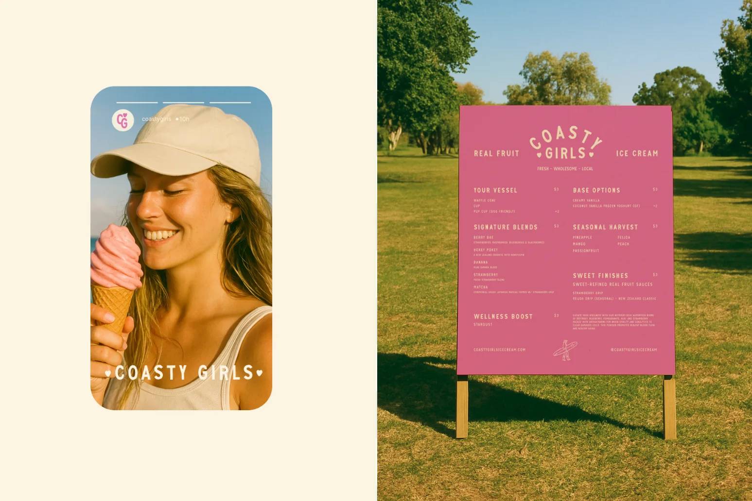 We created a full identity system that blends hand-drawn typography with pastel tones and playful illustrations. The truck wrap was designed to embody the nostalgia of ice cream trucks from childhood memories, with a coastal Californian theme. The tone of voice was carefully crafted to remain playful, authentic, and inclusive—avoiding artificial or exclusive cues. This allowed the brand to stand apart from competitors by speaking with clarity and honesty, while still capturing a sense of fun.